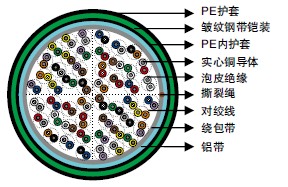• 防潮层:一层裸铝带(厚0.2mm/8mil)以搭接的方式纵包于缆芯之外,以提供100%屏蔽覆盖并防止水汽侵入。对于200对以上电缆