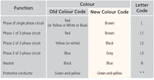 conductor, as specified in Table 1. Circuits for new installations should be wired in new colour coded cables.