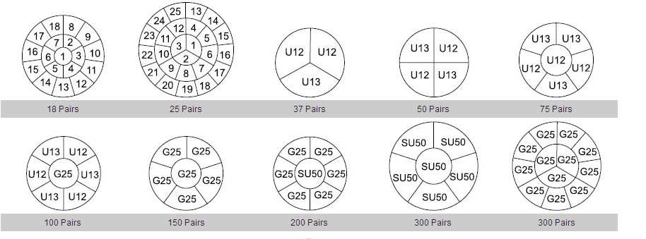 For cables through 600 pairs, 25 pair groups are identified by their binder colours in the same sequence as the