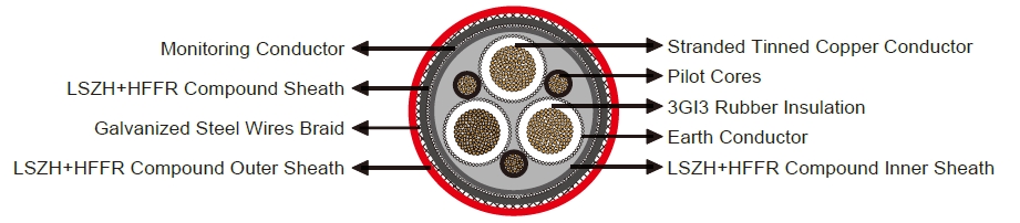 Three main conductors laid-up with three pilot control cores in the outer interstice.Protective cores are concentricalty wrapped over insulation of power cores |