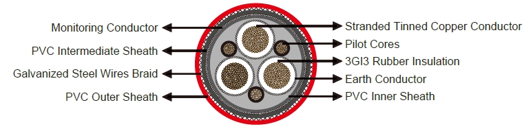 Three main conductors laid-up with three pilot control cores in the outer interstice.Protective cores are concentricalty wrapped over insulation of power cores |