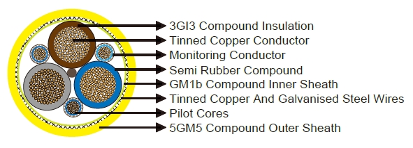 Three power cores laid up with the protective earth conductors split into three in the outer interstices. If there are 3 control cores. the monitoring core is concentrically wrapped over insulation of control cores. |