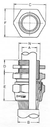 StandardsEN 50262 : 1999, BS 6121 1989 ApplicationsSuitable for all types of unarmoured plastic or rubber sheathed cables for indoor as well as outdoor installations. It is used in applications where it is essential to provide an IP66 seal on the outer sheath of the cable. FeatureSingle compression for cable sheath. Ingress ProtectionIP66 (To IP68 if fi tted with a gasket). MaterialBrass BS 2874 CZ121 Pb3 Thread OptionISO METRIC; NPT; BSP; PG or as specified Seal OptionNeoprene; silicone Plating OptionBrass Finish, Nickel Finish, Chrome Finish or as specified Operating TemperatureStandard seals: -20 °C to +80 °C (Neoprene Seals) Extended seals: -60 °C to +180 °C (Silicone Seals) AccessoriesLock Nut, Sealing Washer, Earth Tag, Shroud, Serrated Washer, Stopping Plug, Reducer, Adaptor Ordering Code(Gland Type / Size & Entry Thread Size), e.g. A2 32/M32 - 10mm |