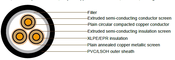 3.8/6.6kV Three Core Individual Screened & PVC Sheathed (Cu Conductor) cables are designed to be used for